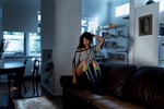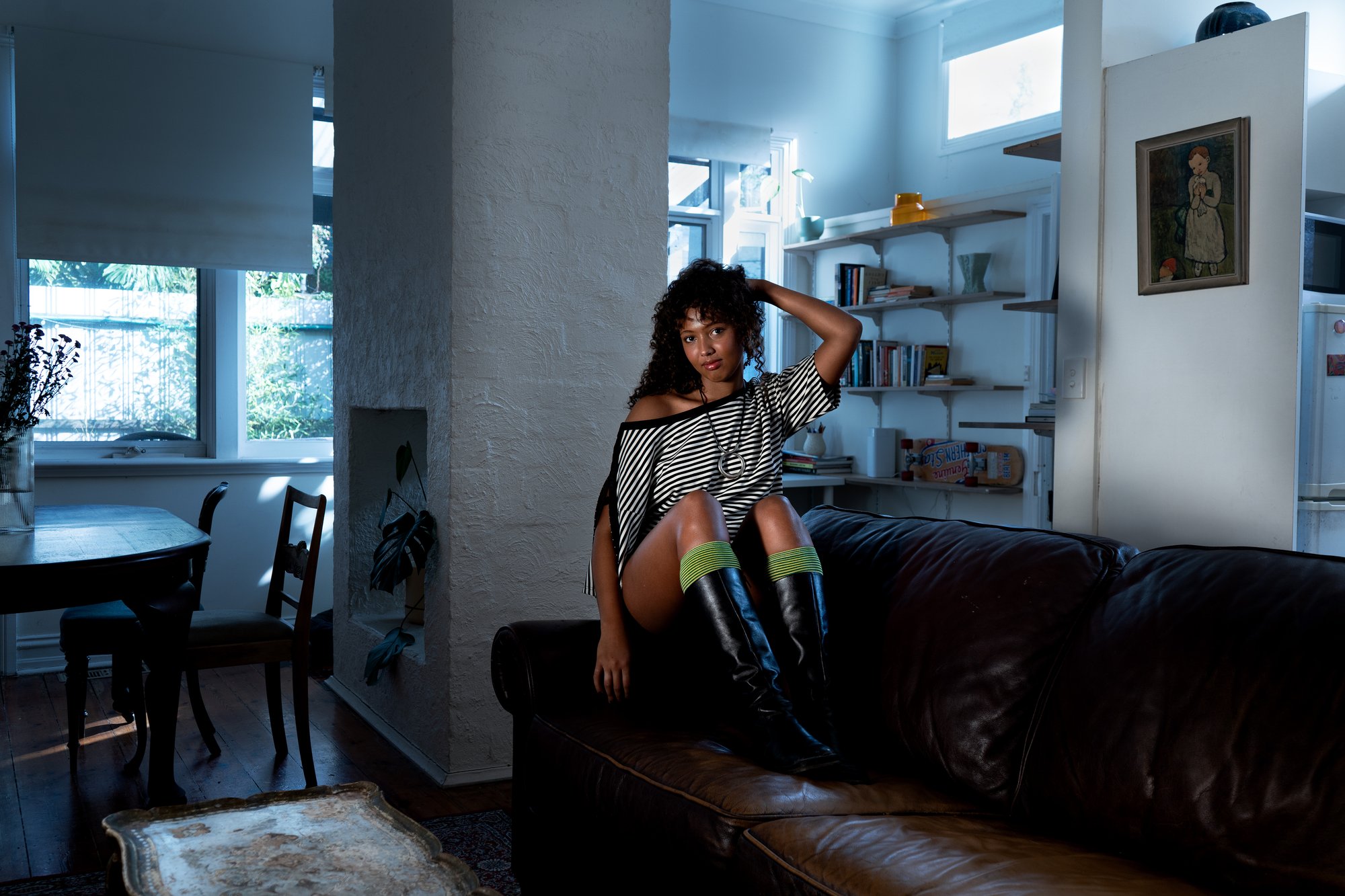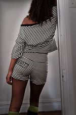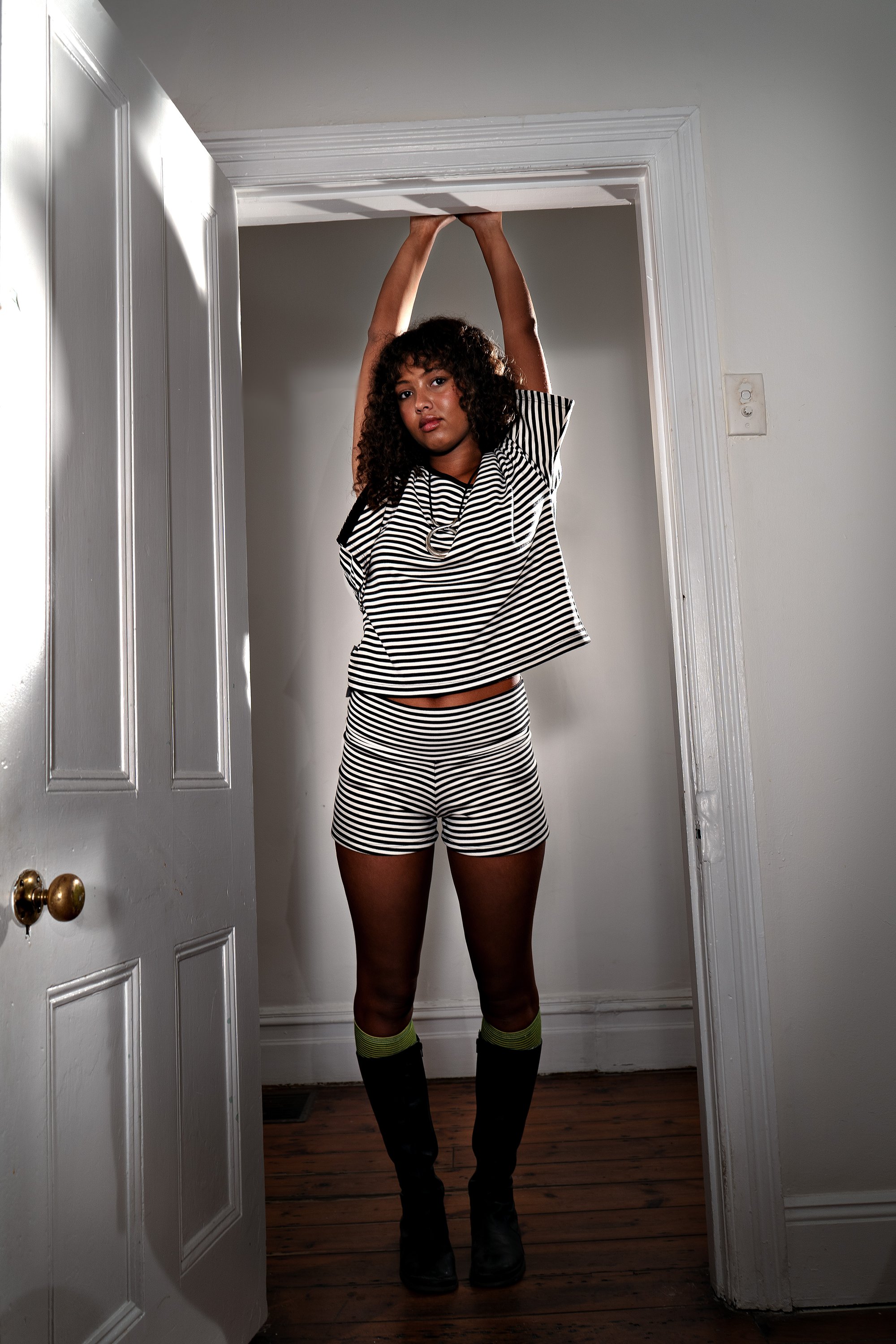 Handmade loose-fit boxy t-shirt, featuring a wide neckline and ribbing on the collar, functioning hook and eye closure on one shoulder seam, and cover-stitched hem finishings.